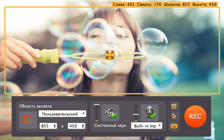 - Управляйте записью с помощью горячих клавиш и панели на рамке захвата