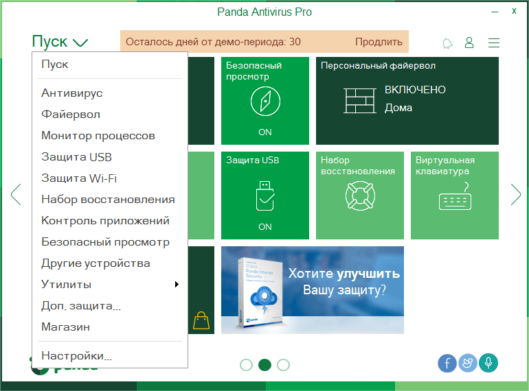 Panda Antivirus Pro гораздо больше, чем просто антивирус: базовая антивирусная защита ПК от вирусов, троянов, червей, шпионов и других угроз, а также автоматический файервол для защиты от хакеров, модуль защиты вашей Wi-Fi от вторжений, виртуальная клавиатура, монитор процессов и контроль приложений для защиты от шифровальщиков. Набор восстановления ПК в критической ситуации.