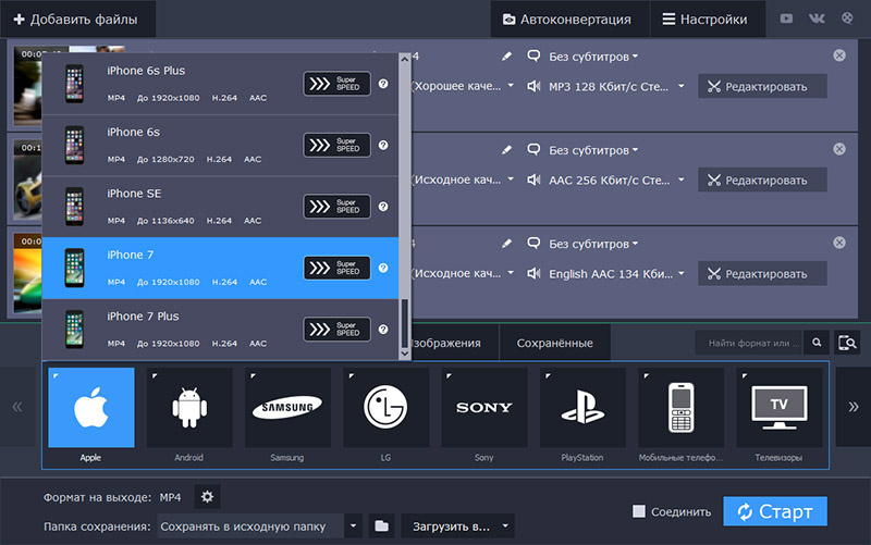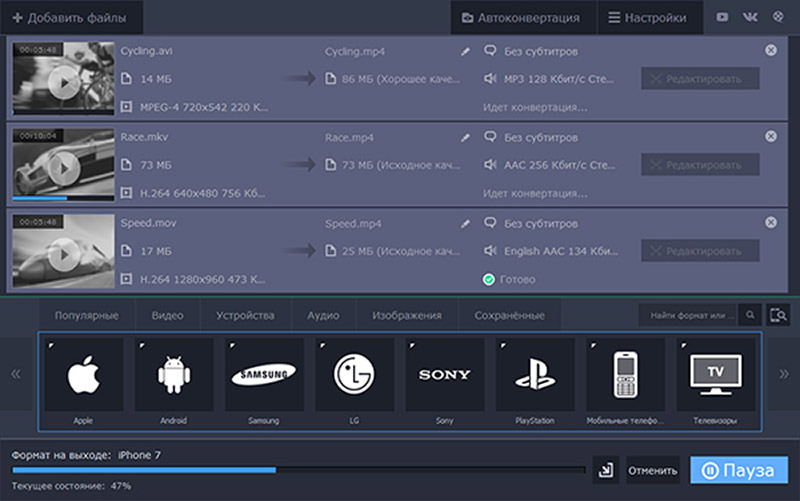 - Оптимизируйте файлы для проигрывания на планшете или смартфоне, выбрав модель из списка